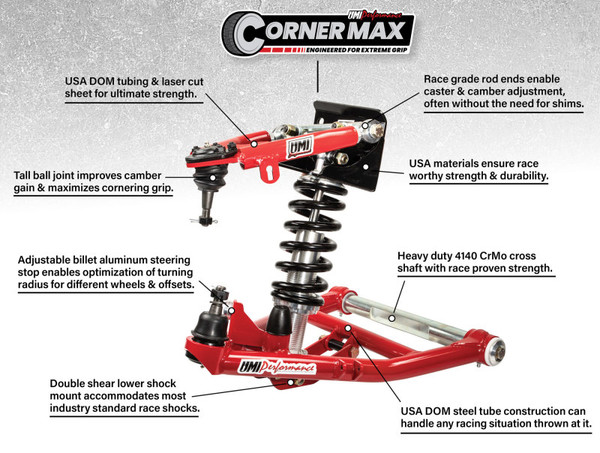 UMI’s Race Proven #cornermax a-arm and mount kit brings race car handling to your truck. Double shear coilover-only mounts hold all popular coilover assemblies.
