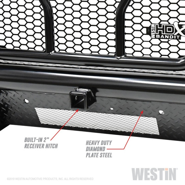 Westins HDX Bandit Bumper combines a heavy duty diamond plate steel bumper constructed of schedule 40 steel pipe with a stylish grille guard featuring 2" diameter outer wraparound wings and 2 3/4" wide upright rubber strips. Designed to protect headlights, grille, hood and front fenders from road hazards, debris and wildlife damage. Features a stylish metal honeycomb mesh screen, which allows maximum airflow to the intercooler or radiator area while accenting the front end styling with a clean and rugged look. Removable mesh screens allow for factory camera and adaptive cruise control options available on some late model Ford applications. HDX Bandit Bumper includes a built-in 2" receiver hitch and (2) heavy duty 9,500 lbs bow shackle mounts, capable of delivering multiple towing options. Compatible for factory fog lamps or LED post mount lights. In addition, some late model Ram and Chevrolet applications feature provisions for factory parking sensors. Bolt-on installation with hardware and mounting brackets included. Available in black powder coat finish.