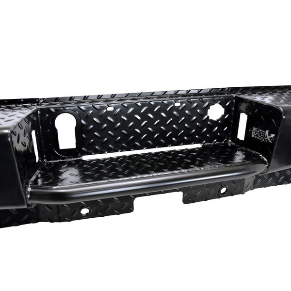 "Stand out from the Competition" with the all new HDX Bandit Rear Bumper from Westin. Built to compliment the style, precision, and durability of the matching HDX Bandit Front Bumper, this all new "off-road style" rear bumper, is clearly a cut above. Unlike the competition, which features an overlapping two piece design and an ugly weld which can warp the metal and is prone to rust, the new HDX Bandit Rear Bumper features an extremely clean, one piece design. The stamped diamond plate step surface is constructed of 11 gauge plate steel and features a welded inner structure for maximum strength. A unique "corner step" design provides extra wide step area to allow easy access to bed and cargo area. HDX Bandit Rear Bumper includes hardware, mounting brackets, flush mount LED license plate lights and two standard LED back up lights. Fully compatible with blind spot monitors and parking sensors, and can also accommodate an OEM hitch. HDX Bandit Rear is designed for heavy duty performance and extended life that is backed by a 3 year warranty with a black powder coat finish. The new HDX Bandit Rear Bumper is truly in a class by itself.