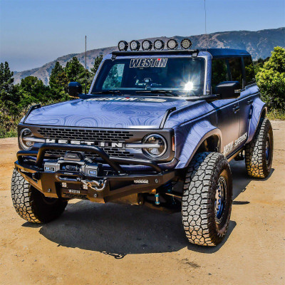 The XTS Front Bumper from Westin is an attractive, winch-capable upgrade that enhances both front end protection and functionality. It features a low profile winch mount to improve air flow. The XTS Front Bumper provides maximum strength and durability by employing a lightweight 10-gauge steel shell combined with a solid 4-gauge center section capable of accommodating most recovery winches up to 12k lbs. The XTS Front Bumper adds welded mounting points for recovery, letting you hit the trail with confidence! Fully compatible with factory sensors and capable of adding either an angular or round bull bar (sold separately) for added grille protection and styling. It also provides a wide variety of auxiliary lighting mounting points. The XTS Front Bumper has a durable textured black powder coat finish with an e-coated base coat, providing long lasting corrosion protection from the elements, and is backed by a 3-year warranty. Includes all necessary mounting hardware for a hassle-free installation. Complete your vehicles upgrade with a form fitted skid plate (sold separately), designed to provide maximum protection off the highway and great styling on the street. XTS is an easy choice for Ford Bronco owners.