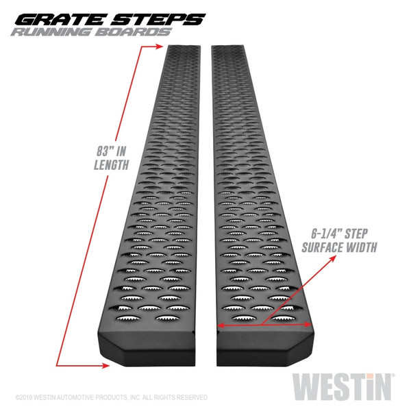 Westin's Grate Steps Running Boards are engineered to provide maximum traction without sacrificing style. The 6 1/4" step surface width features an aggressive 1/4" high punched tread allowing traction in any weather condition. The unique serrated edges help clean dirt, snow and mud off your boots to keep truck cab clean. Grate Steps Running Boards feature stylishly formed and fully welded ends with a custom die-cast riveted logo badge. E-coated base coat provides long lasting corrosion protection which far surpasses that of the competition. Solid 1-piece construction makes the Grate Steps Running Boards ideal for construction, commercial, vans and utility use. Available in universal lengths (54", 68", 75", 79", 83", 86" and 90") with vehicle specific mount kit required, sold separately. Available in textured black finish.