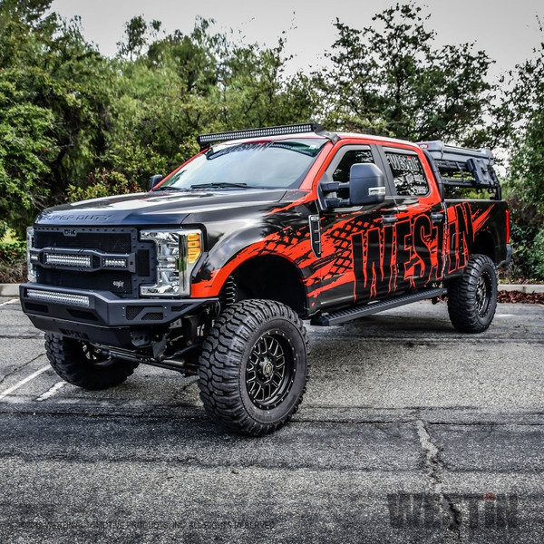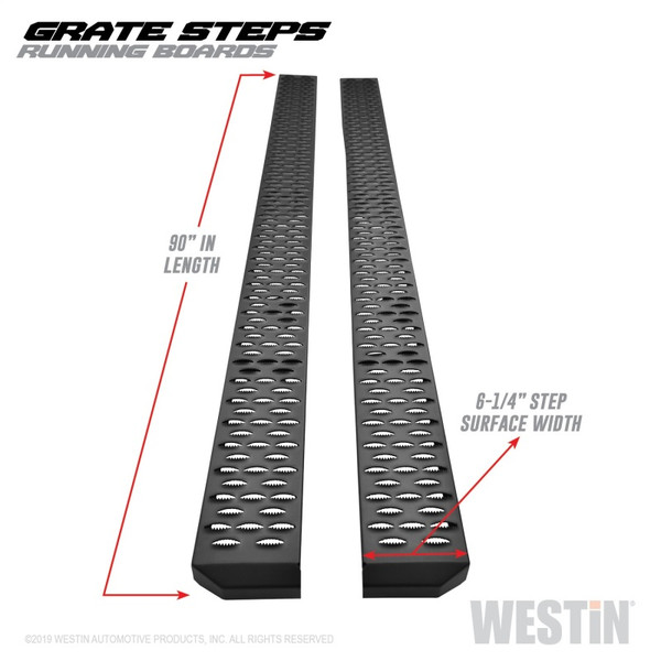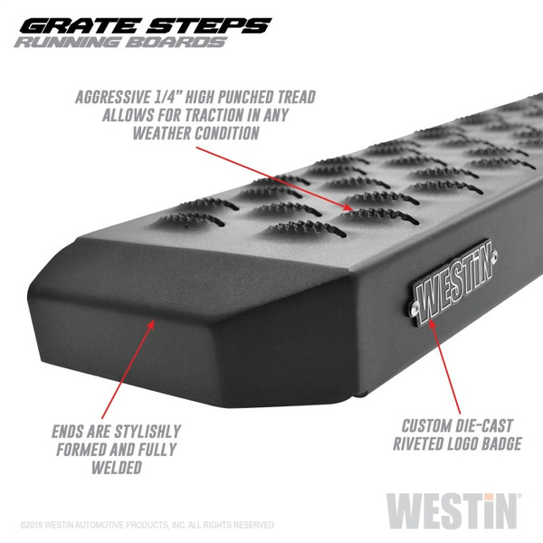 Westins Grate Steps Running Boards are engineered to provide maximum traction without sacrificing style. The 6 1/4" step surface width features an aggressive 1/4" high punched tread allowing traction in any weather condition. The unique serrated edges help clean dirt, snow and mud off your boots to keep truck cab clean. Grate Steps Running Boards feature stylishly formed and fully welded ends with a custom die-cast riveted logo badge. E-coated base coat provides long lasting corrosion protection which far surpasses that of the competition. Solid 1-piece construction makes the Grate Steps Running Boards ideal for construction, commercial, vans and utility use. Available in universal lengths (54", 68", 75", 79", 83", 86" and 90") with vehicle specific mount kit required, sold separately. Available in textured black finish.