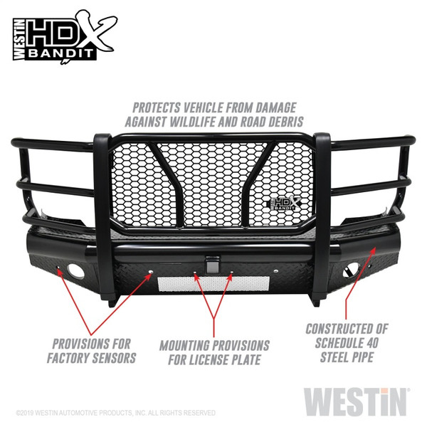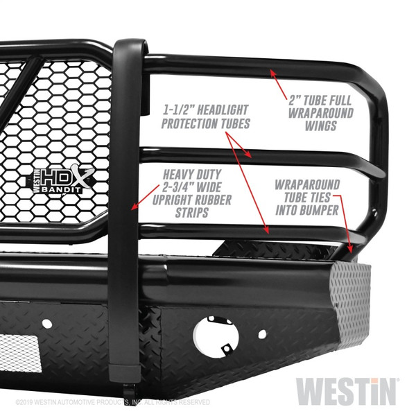 Westins HDX Bandit Bumper combines a heavy duty diamond plate steel bumper constructed of schedule 40 steel pipe with a stylish grille guard featuring 2" diameter outer wraparound wings and 2 3/4" wide upright rubber strips. Designed to protect headlights, grille, hood and front fenders from road hazards, debris and wildlife damage. Features a stylish metal honeycomb mesh screen, which allows maximum airflow to the intercooler or radiator area while accenting the front end styling with a clean and rugged look. Removable mesh screens allow for factory camera and adaptive cruise control options available on some late model Ford applications. HDX Bandit Bumper includes a built-in 2" receiver hitch and (2) heavy duty 9,500 lbs bow shackle mounts, capable of delivering multiple towing options. Compatible for factory fog lamps or LED post mount lights. In addition, some late model Ram and Chevrolet applications feature provisions for factory parking sensors. Bolt-on installation with hardware and mounting brackets included. Available in black powder coat finish.